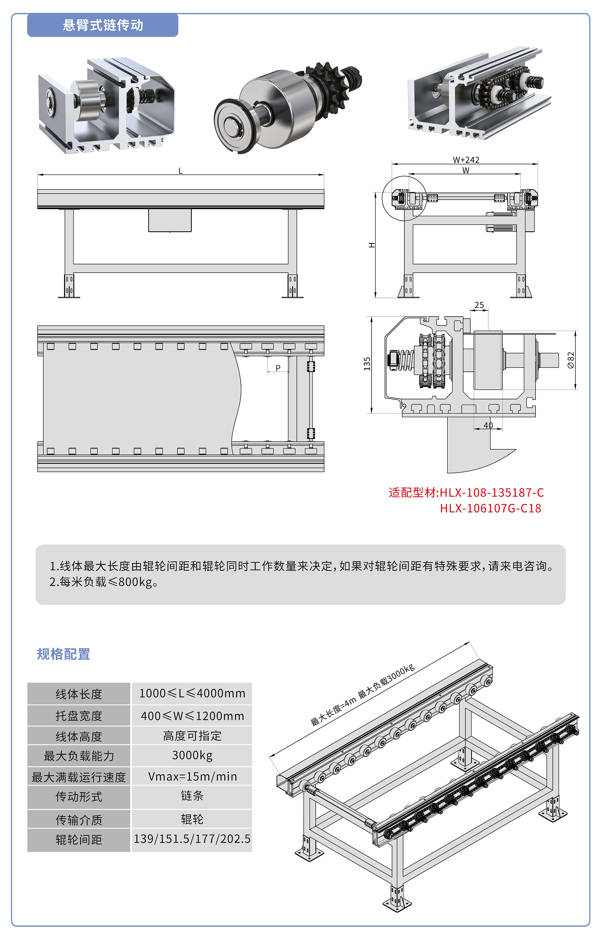 采用135187鋁型材,鏈輪傳動,鍍鉻滾輪鑲嵌銅套實現(xiàn)積放功能,負(fù)載3000kg/米,最大負(fù)載速度15M/min, 輪距139、151.5、177、202.5可選,適用托盤寬度400-1200mm,線體長度范圍1000-4000mm, 高度根據(jù)需求定制.