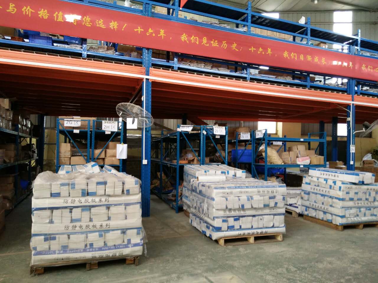 匯利興配件專區(qū)一角,防靜電膠皮整齊擺放于鏡頭前,海量庫(kù)存量、上千種配件系列全集聚于此;精益管、流利條、工作臺(tái)板、各式滾筒等盡在匯利興。