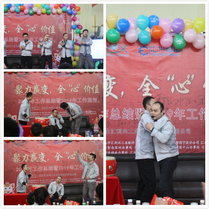 《開門紅》舞蹈 緊接著是一場聽覺的盛宴,胡總和胡前敏家人帶來的詩朗誦,貫穿著唯美的中國風(fēng)韻,溫和而又親切的聲音屢現(xiàn)耳旁,字里行間都展示了感恩之心的重要性。 小品《推銷》,銷售部家人演繹的惟妙惟肖,穿插著銷售部全體家人精神面貌,一聲聲“為夢想沖刺,我是匯利興的一名忠誠戰(zhàn)士”,現(xiàn)場士氣高昂、力量雄厚;從側(cè)面展示了雖一路挫折無數(shù)坎坷無數(shù),但決不放棄的信心與理念,并將公司精神面貌鮮活的展現(xiàn)在眾人面前,為他們點贊! 點燃全場的一曲《相親相愛一家人》,物控部每位家人相互搭肩,每個人都唱出了自己的心聲,我們是一家人,相親相愛的一家人,希望家人們在2019年不忘初心,再出發(fā)。