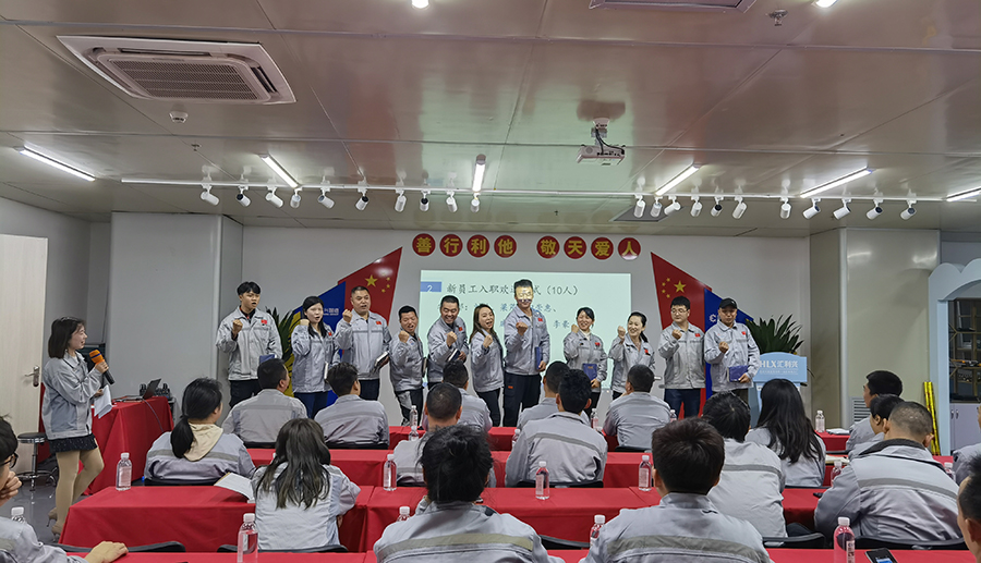 會議開始,三位高管敲響2021年征程的號角,鼓聲震天,士氣如虹,潛移默化鼓舞著戰(zhàn)友們奮勇前進(jìn),并以這種以評促進(jìn)、你追我趕的“激勵文化”,鞭策著員工們不斷爭先創(chuàng)優(yōu),推動企業(yè)發(fā)展內(nèi)生動力,從而形成“我來干、搶著干、努力干”的工作作風(fēng)。 會議第一項,企業(yè)文化展示。全體員工整肅衣冠,對倍加推崇的孝道、商道、人道鄭重鞠躬,莊嚴(yán)宣誓企業(yè)愿景:“成為行業(yè)優(yōu)秀的智能自動化產(chǎn)業(yè)鏈集成服務(wù)商”,企業(yè)使命:做受尊敬的好人,造受尊敬的產(chǎn)品,辦受尊敬的企業(yè),建受尊敬的平臺,企業(yè)精神“用情做人、用心做事”,團(tuán)隊精神“忠誠團(tuán)結(jié)、勤奮進(jìn)取”,工匠精神:創(chuàng)于手、精于工、智于器、匠于心、品于行等。 會議第二項。新員工入職歡迎儀式,培育新生力量,助力企業(yè)發(fā)展,增強企業(yè)核心競爭力,強化人才建設(shè)梯隊。由客服部經(jīng)理石樂歡為新入員工頒發(fā)紀(jì)念品。