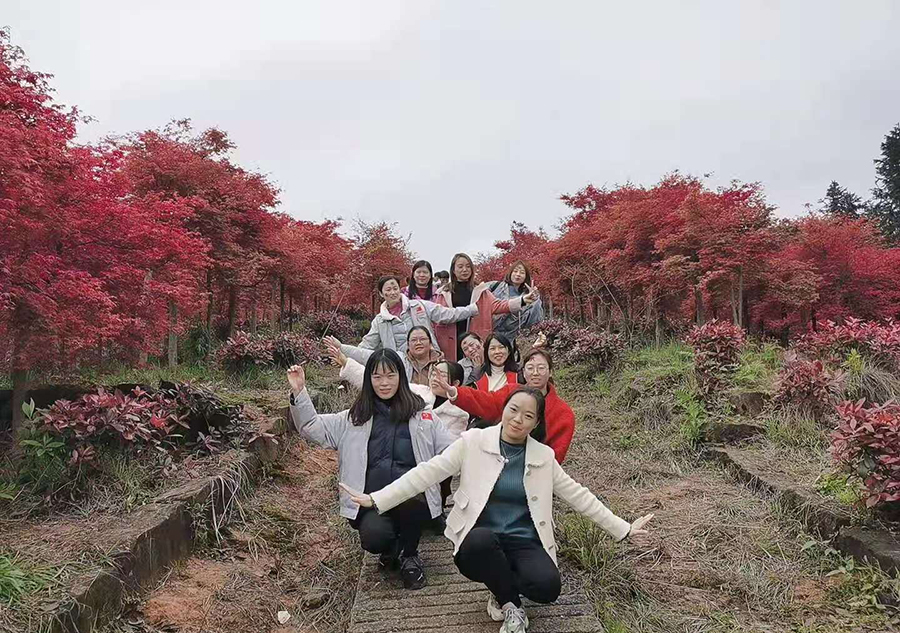 春風(fēng)得意馬蹄疾,一日看盡萬里楓。品嘗農(nóng)家特色菜肴后,全員整裝移步紅楓林,漫步紅楓葉區(qū),與山水自然融為一體,放松心情,享受大自然溫暖,大家愜意的走在楓林小道上,環(huán)望四周楓葉搖曳處充滿著春天的氣息,遠(yuǎn)望近觀密密扎扎的樹枝上呈火焰紅,把滿山裝扮的紅彤彤的,極盡壯觀;在春陽照耀下,微風(fēng)輕拂,楓葉左右搖曳,姹紫嫣紅,惹人陶醉,十分美麗,宛若進(jìn)入了一個童話世界里,讓大家瞬間感覺自己像是在仙氣飄渺的世外桃源中,一掃平時工作的壓力,十分放松;大家三五成群,談笑風(fēng)生,一路上聊著鬧著,畫面其樂融融,拍照留影,感受著春天的紅楓秋色。
