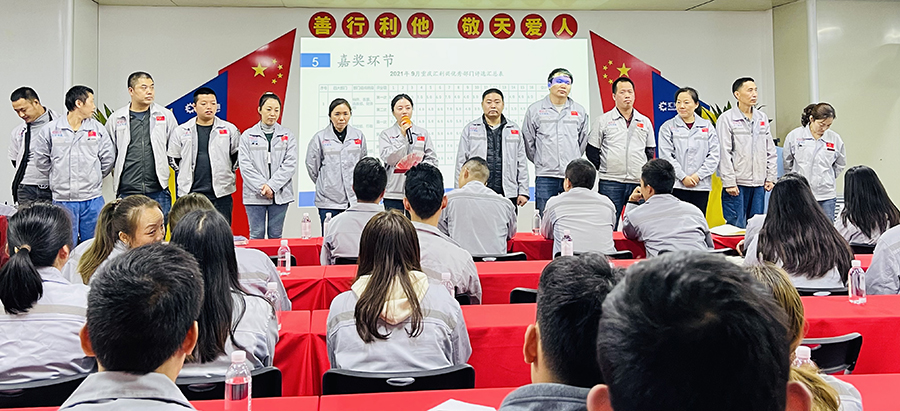 10月20日18點(diǎn)45分,匯利興西南工廠全體員工在匯利興學(xué)校召開(kāi)9月月度會(huì)議,會(huì)議總結(jié)上月項(xiàng)目發(fā)展情況,規(guī)劃部署下月生產(chǎn)計(jì)劃,進(jìn)一步推進(jìn)公司戰(zhàn)略實(shí)施,由行政部主持。 會(huì)議前,由二位核心高管擊響士氣鼓,鼓舞士氣,凝心聚力,鼓舞著戰(zhàn)友們奮勇前進(jìn)和堅(jiān)決打勝仗的決心,并以這種以評(píng)促進(jìn)、你追我趕的“激勵(lì)文化”,潛移默化融于員工的日常工作中。 宣讀企業(yè)文化,向文化三道孝道、商道、人道鄭重鞠躬,并對(duì)本月新入員工進(jìn)行歡迎儀式。